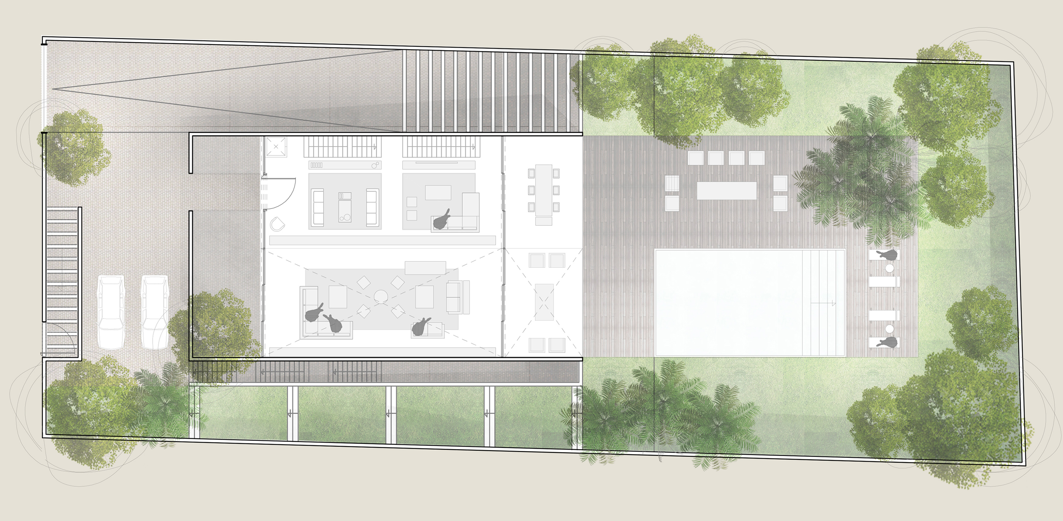 The taijitu is a symbol that represents the concepts of the Chinese philosophy of yin and yang, a concept that in the case of this house, represents the balance between empty and full spaces at the same time the dynamic play of open and closed interactions within the spaces.